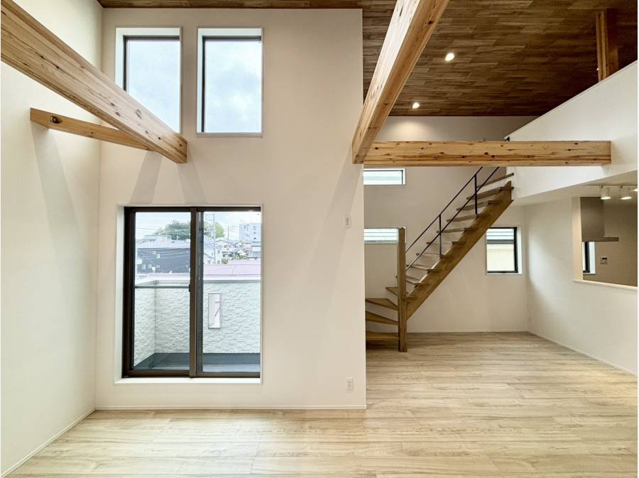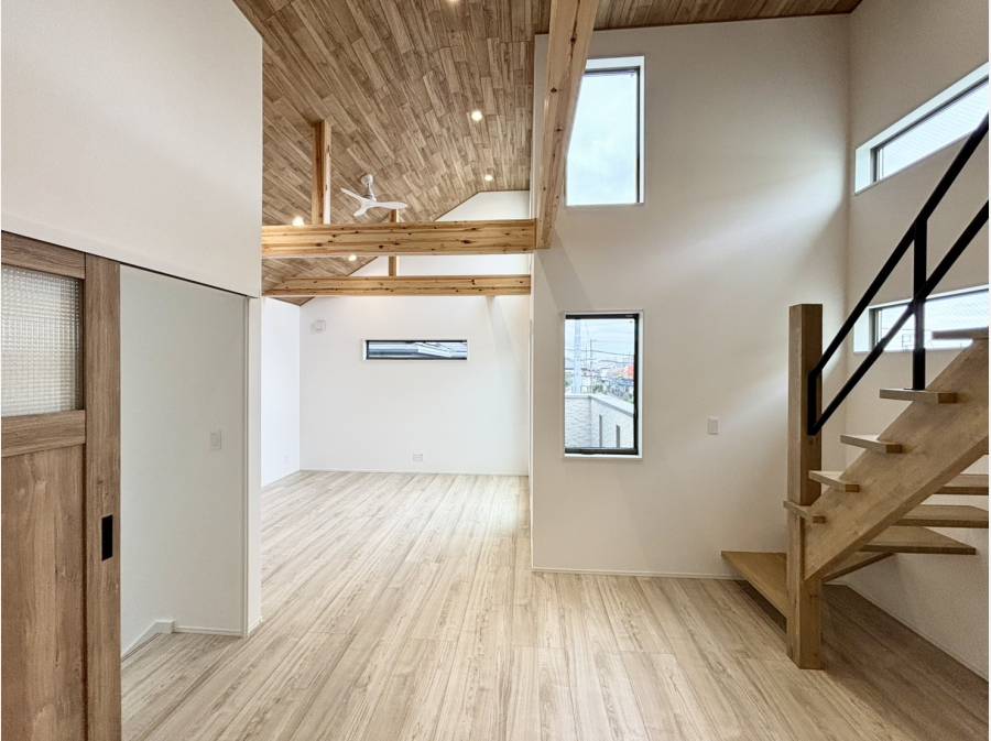 キッチンから全体を見渡せるので、料理をしながらの会話も弾みます。2階は広めの居室としっかりした収納を備え、ライフスタイルに合わせてアレンジが可能です。