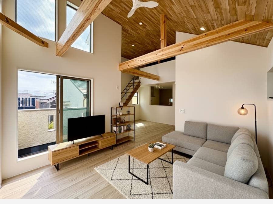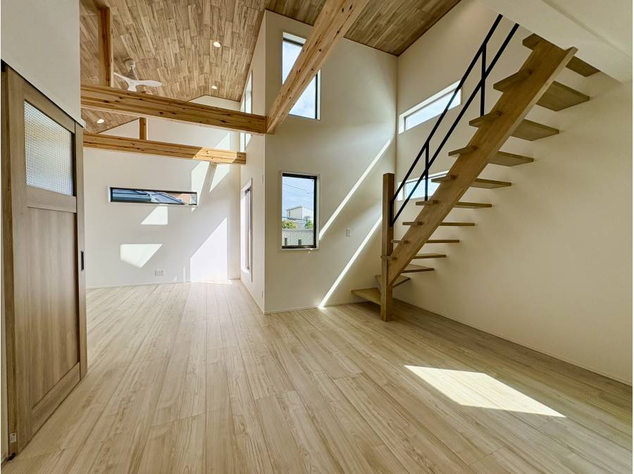 住宅のLDKは約21.2畳の広さを持ち、開放感を生み出す「勾配天井」と美しい「化粧梁」が印象的です。