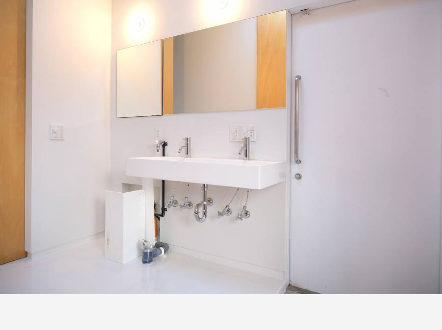 造作のバスルームからも中庭へ。