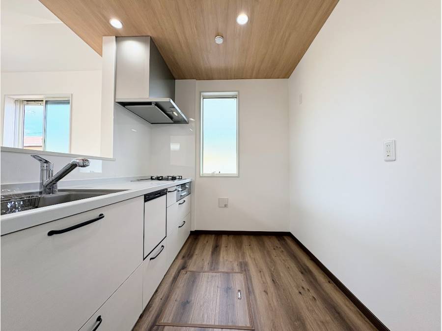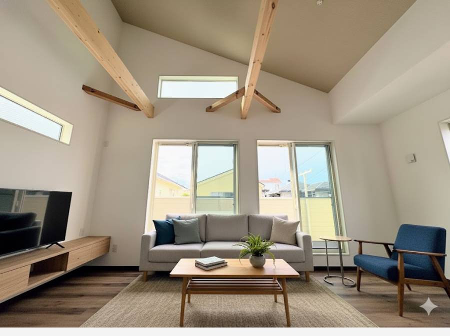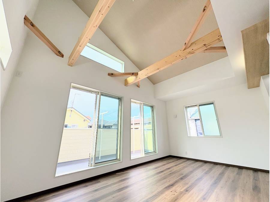 室内は、勾配天井を採用したLDKが特徴です。天井の高さを活かした設計により、明るく広がりのある空間が広がっています。