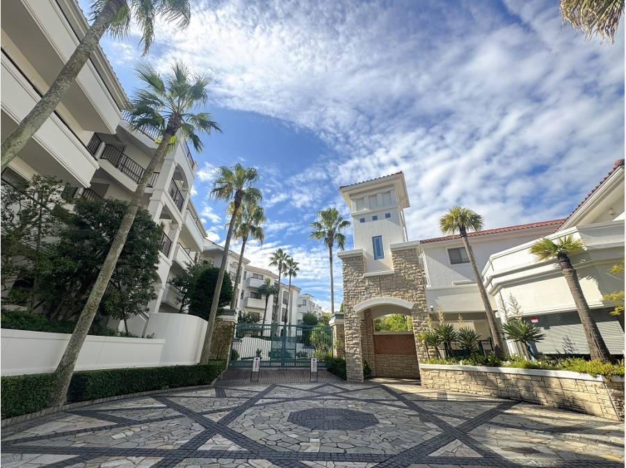 背の高いパームツリーが風に揺れ、白壁の外観とオレンジ色の屋根がリゾートムードを感じさせます。