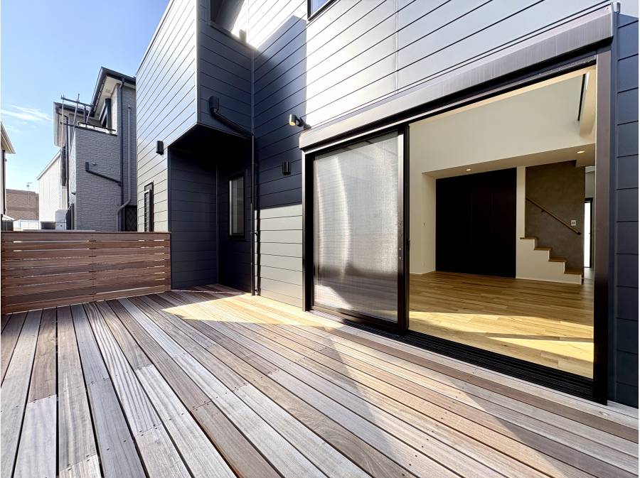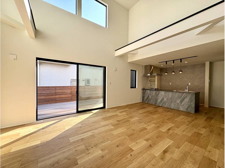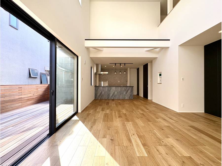 ウッドデッキや吹抜から光が降り注ぐ21.5帖のLDKが魅力の明るい住まい。