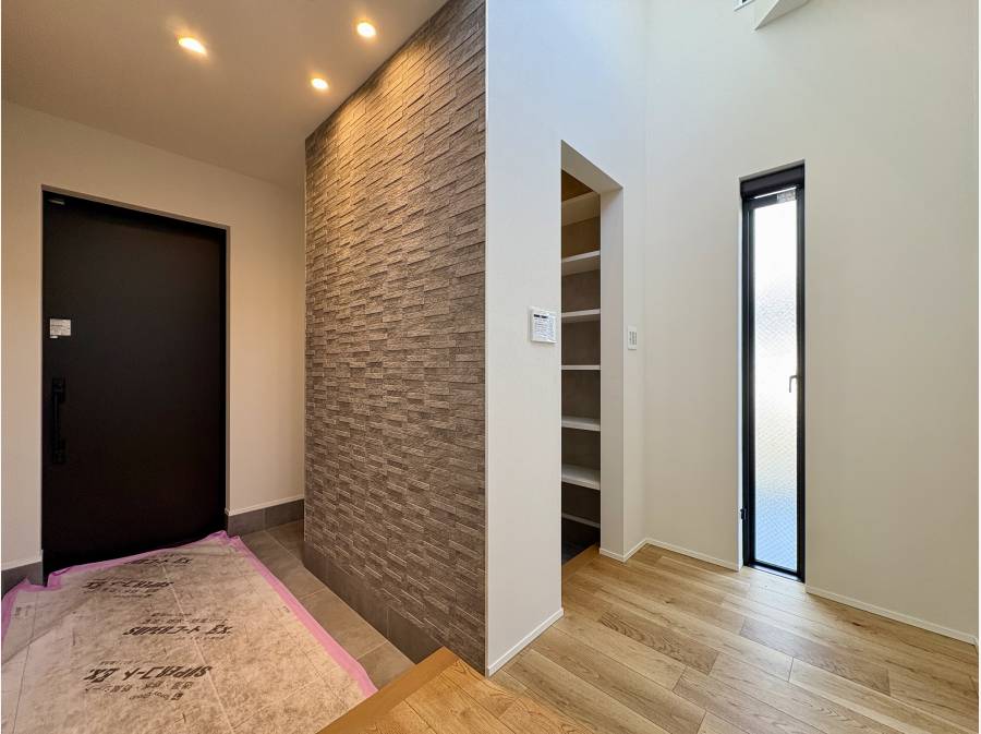 玄関を入ると、吹抜のある広々とした空間が広がり、開放感が感じられます。壁面には調湿・脱臭効果のあるエコカラットが施され、上品で快適な雰囲気を演出します。