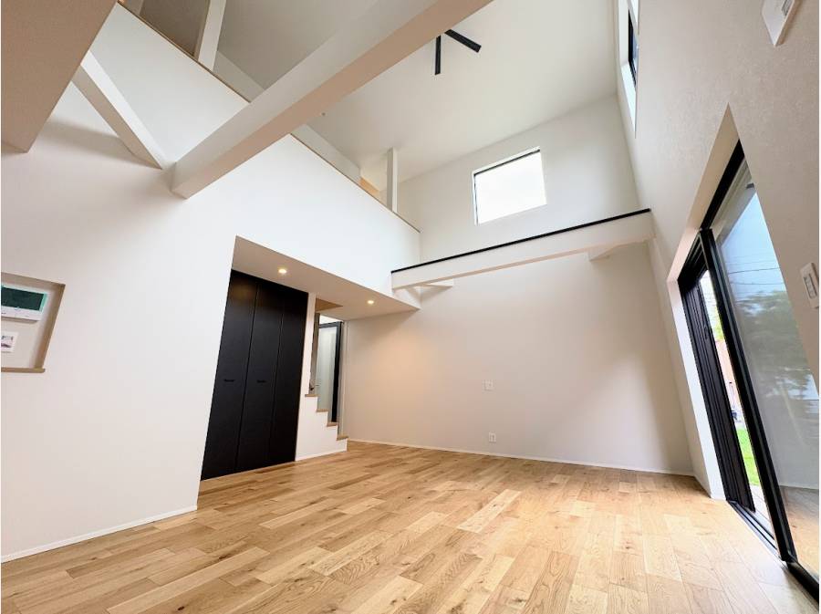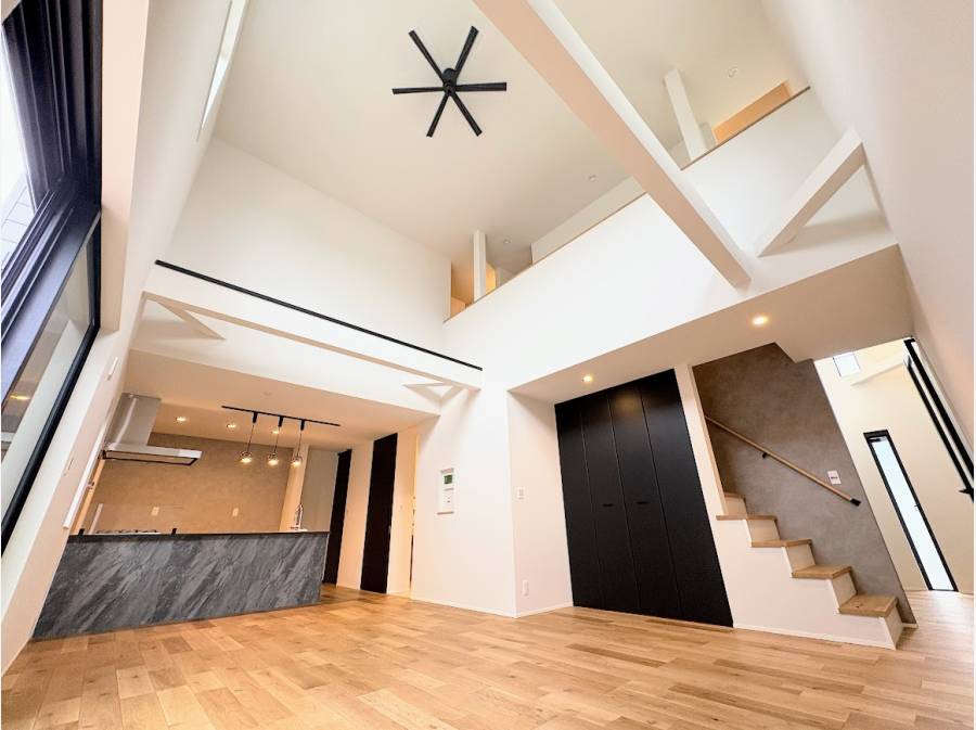 約21.5帖の広々としたLDKは吹き抜け構造になっており、縦方向の広がりが加わることで、明るさと開放感が際立ちます。