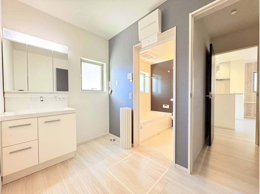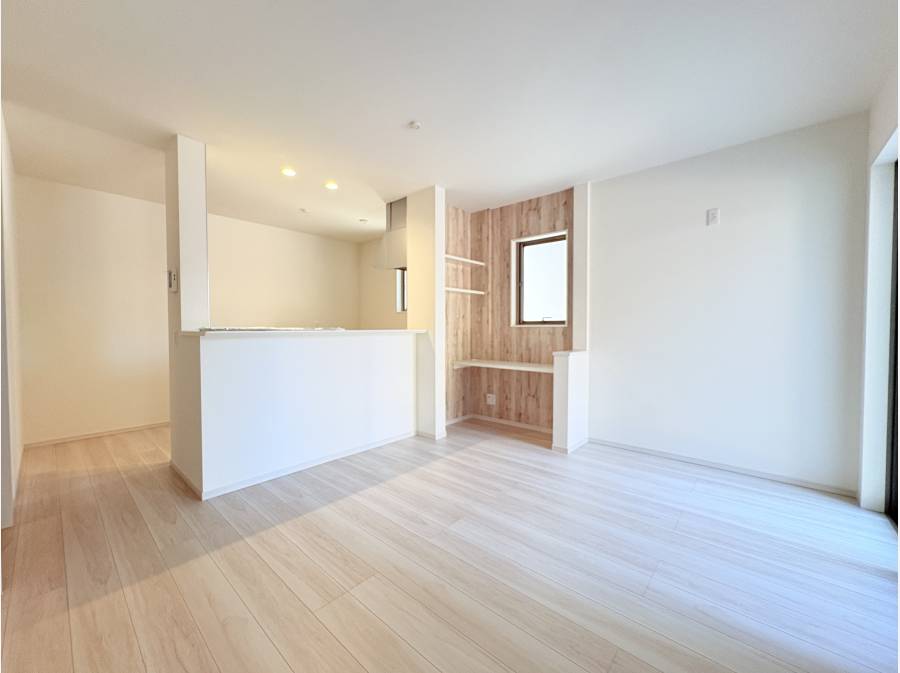 白を基調とした明るく清潔感のある室内に、湘南らしいアクセントクロスが映え、上質でおしゃれな空間が広がっています。