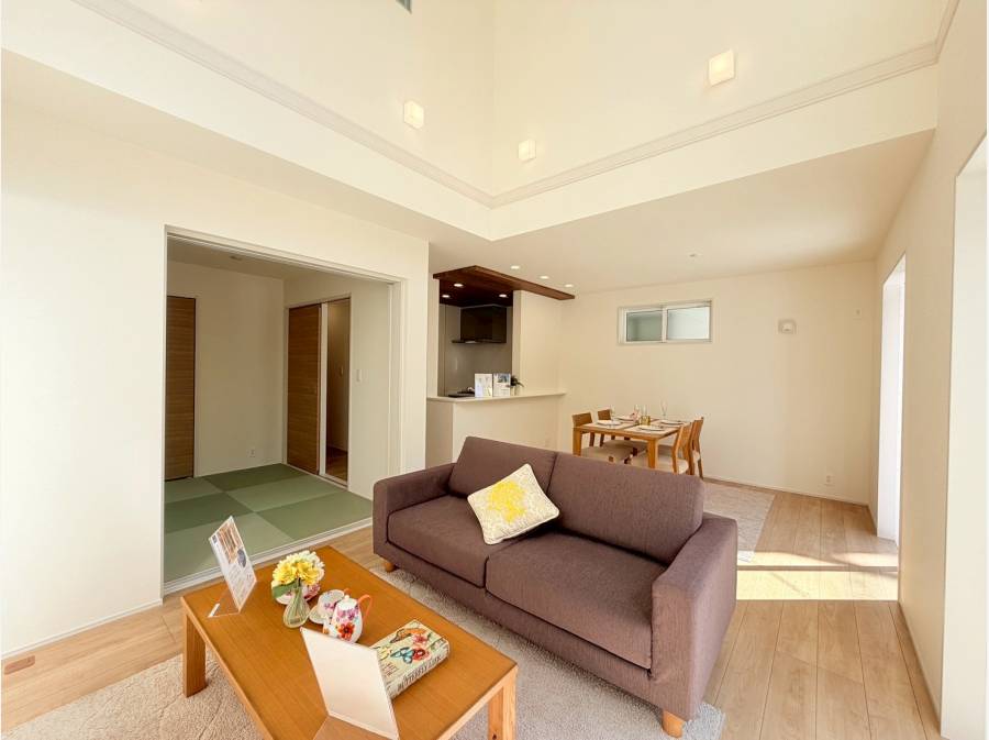 リビングは吹き抜けのある開放的な空間で、やわらかな光が差し込み、自然と家族が集まりたくなる場所に。
