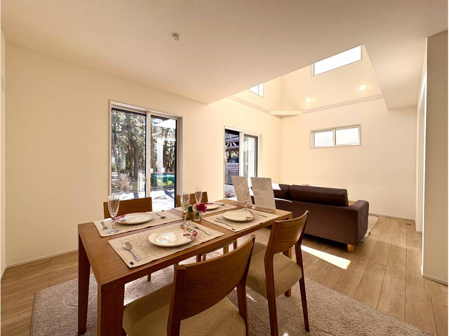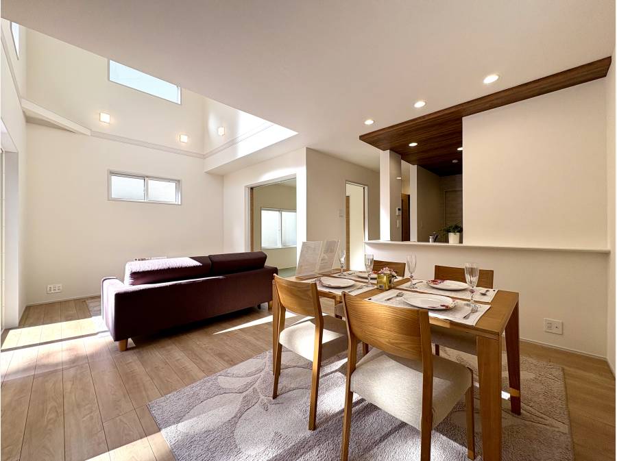 上部からの豊かな採光がリビング全体を明るく開放的に演出し、フルフラットカウンターのシステムキッチンとともに洗練された団らんの場を創り出します。