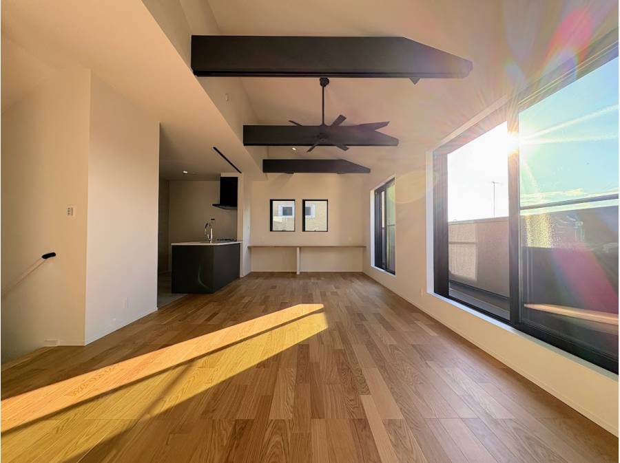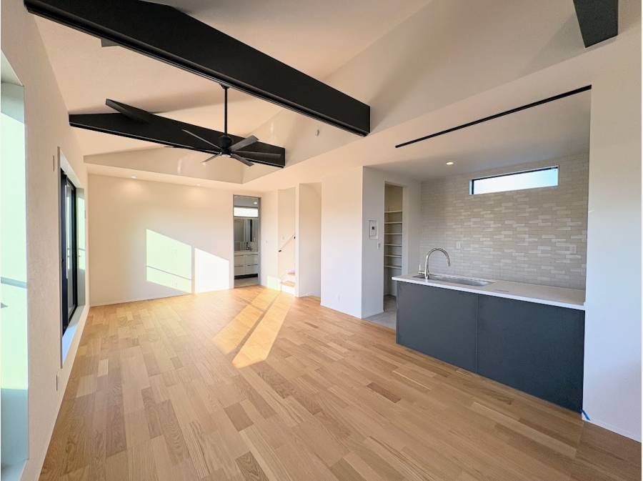 室内では約21帖のLDKが中心となり、勾配天井のデザインが縦方向の広がりを生み出しています。明るく広々としたリビングで、家族がのびのびと過ごせる空間です。