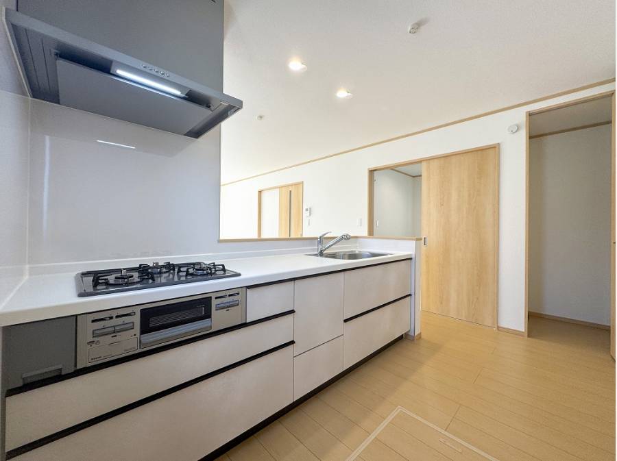 LDKは約18帖の広さがあり、陽当たりの良いリビングを見渡せる開放的なキッチンも広々として使い勝手が良さそうです。