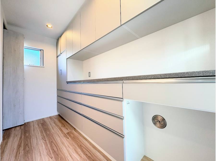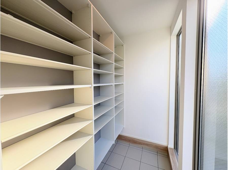 また、見た目だけでなく、実用性も十分です。大型パントリーやシューズインクローゼットなど、収納スペースが充実しており、生活感のあるアイテムもすっきりと片付けられる設計になっています。