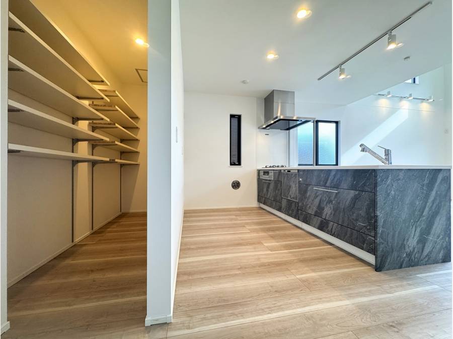 家族の集まるリビングは2階にあり、見どころはキッチン裏手の大きなパントリー。