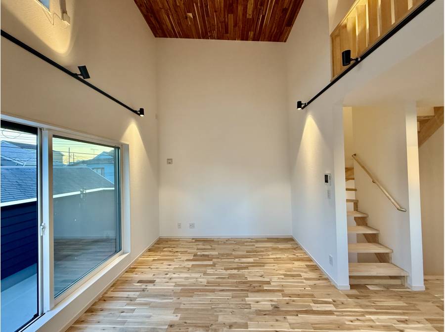 約20.6帖のLDKは、アカシア無垢材の床と勾配天井が特徴的で、やわらかな陽光が差し込み、自然の温もりを感じられる空間です。