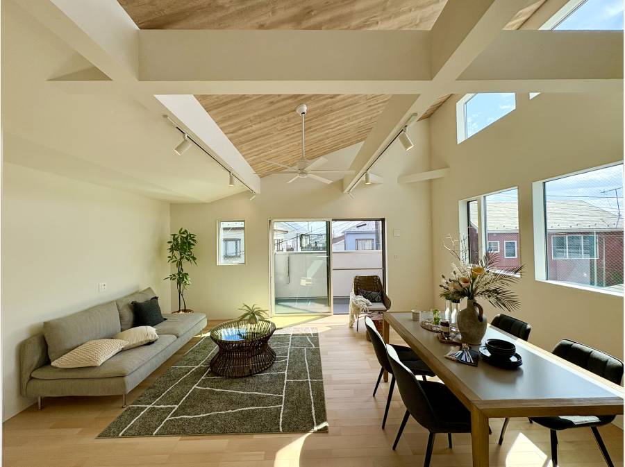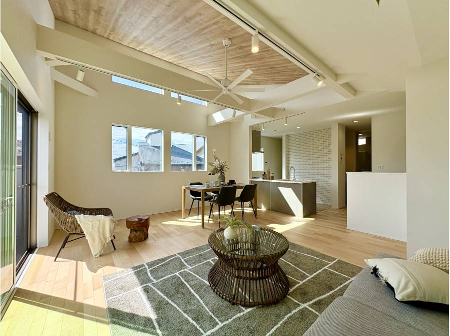 23.1帖の広々としたLDKは、開放感のある勾配天井が特徴的です。