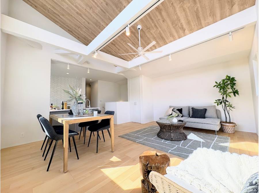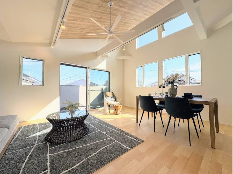 辻堂駅から徒歩14分のこだわりのデザインの新築邸宅。約23帖超の吹き抜けLDKが開放的です。