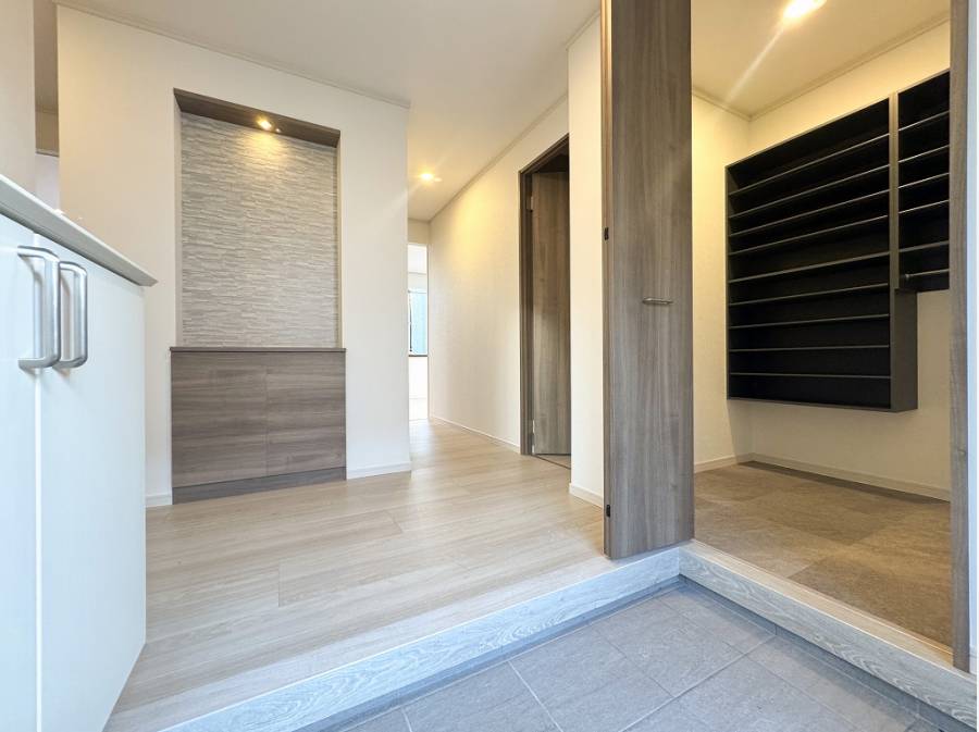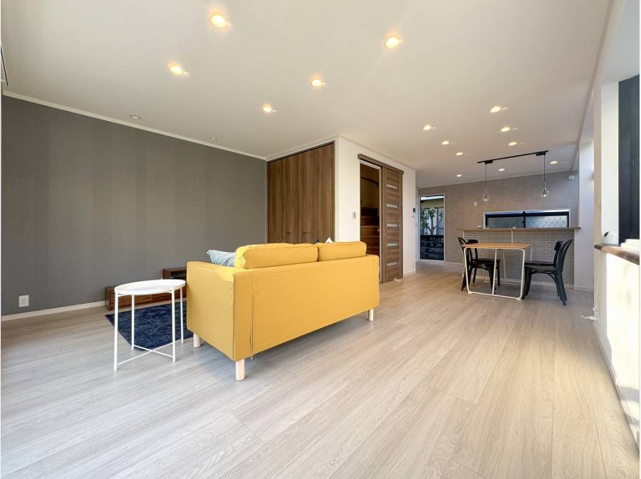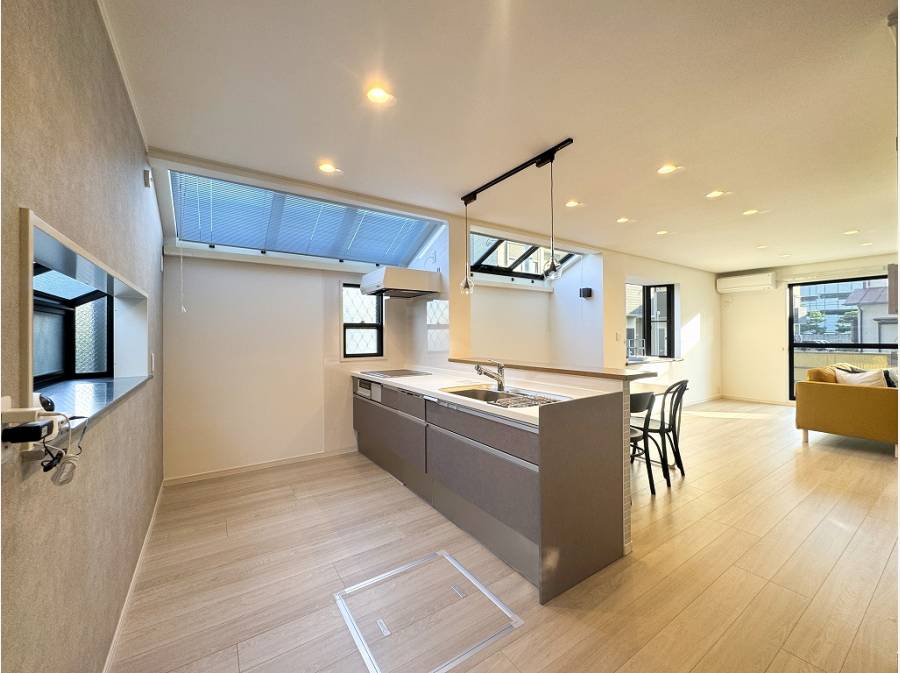開放的なエントランスの先に広がるのは、キッチンサイドから伸びるトップライト(天窓)が主役の22帖超LDK。
