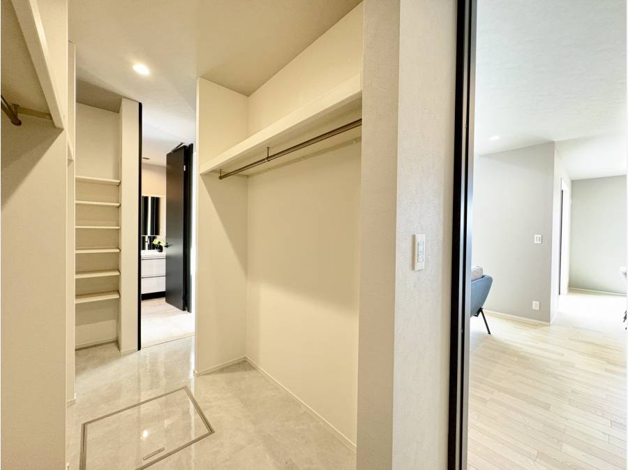 LDKとパウダールームにも繋がる回遊動線のファミリークローゼット