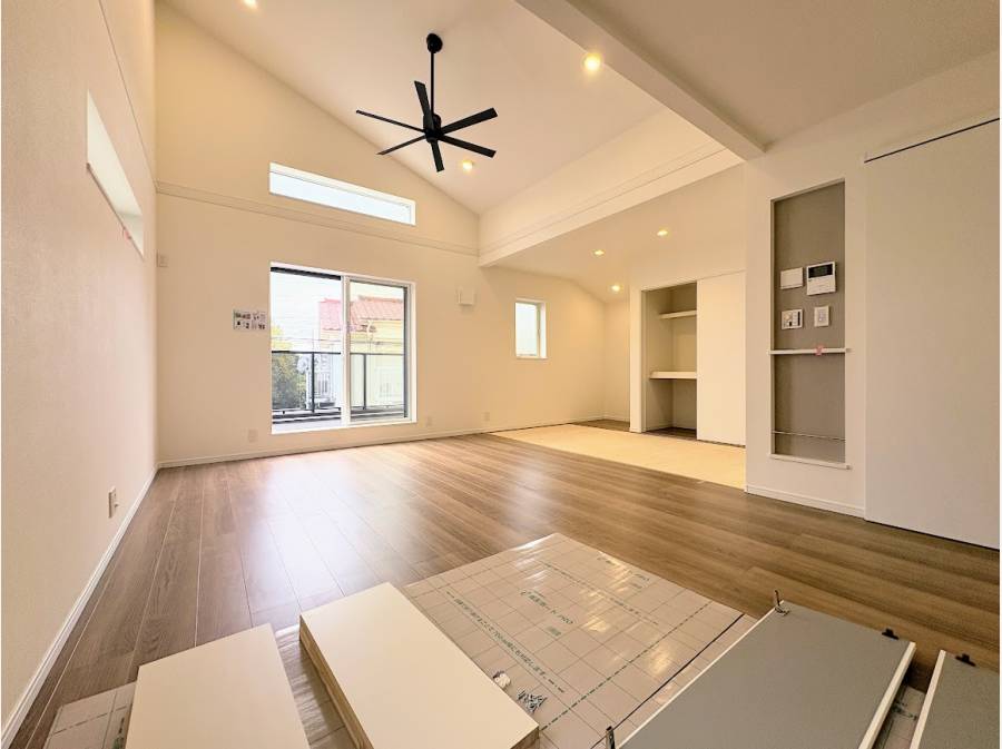 この住まいは、ご家族が自然と集う空間作りにこだわっています。LDKには勾配天井を採用し、広々とした開放感を演出。また、隣にはタタミスペースを設けており、多様な用途で活用できるくつろぎの場をプラスしました。