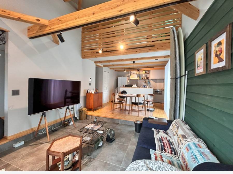 吹き抜けリビングから降り注ぐ光、ウッドデッキやフリールーム、趣味を楽しむガレージスペースなど、暮らしを豊かにする工夫が詰まっています。ガルバリウムと天然木が織りなす外観は、シンプルながら存在感のある湘南モダンデザイン。