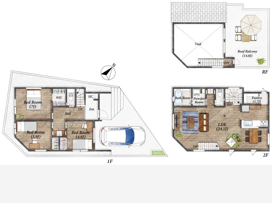 空を楽しむもコンセプト通り屋上には約14.8帖にもなる空と繋がる開放的なスカイバルコニーを配置。