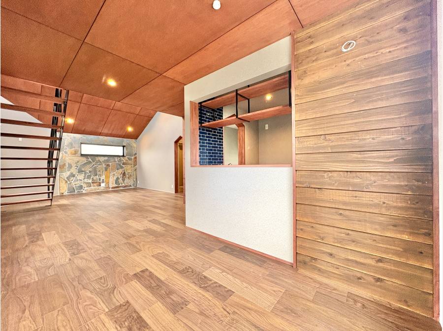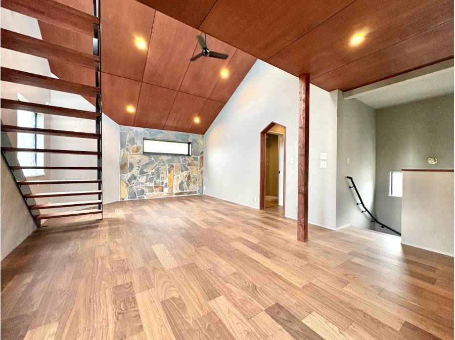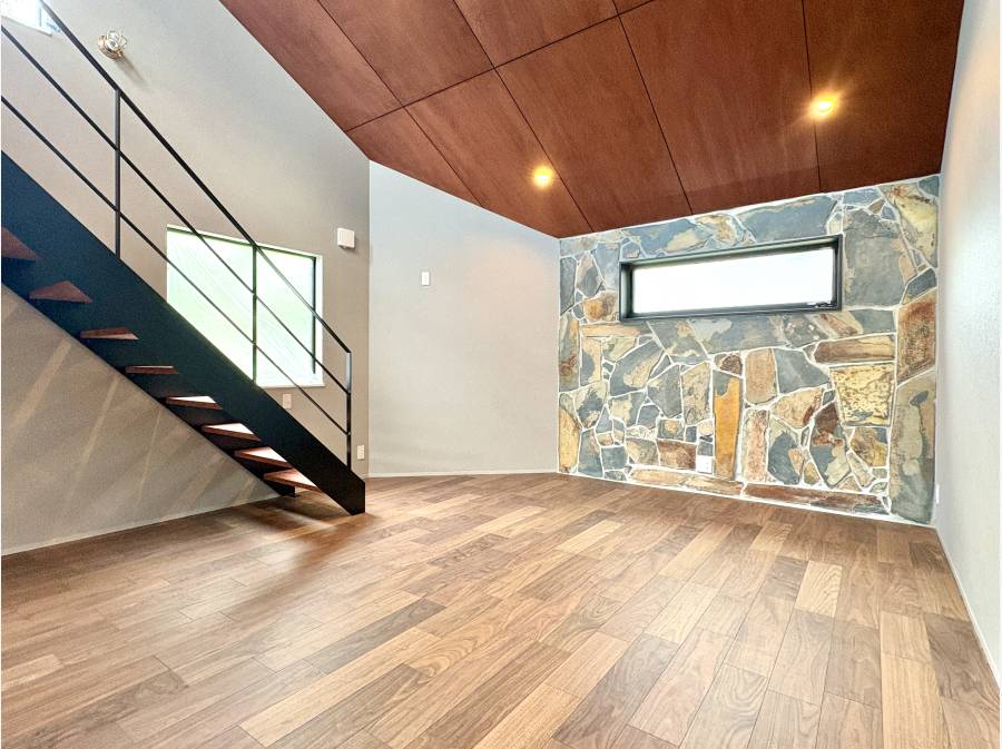 リビングには勾配天井と板張り天井を採用し、鉄骨階段や石張りの壁がアクセントとなる、まるでキャビンのような上質な空間を演出しています。