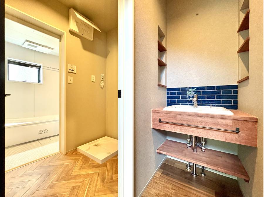 室内は、家事の効率を高めるパントリーや、デザイン性と機能性を両立した造作独立洗面台など、細部まで配慮が行き届いた設計です 。