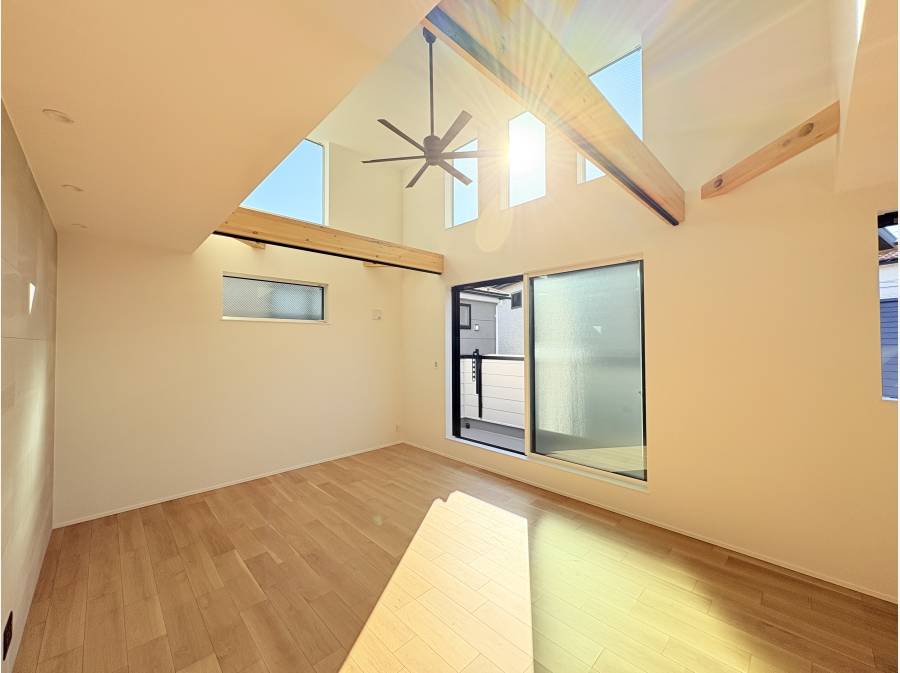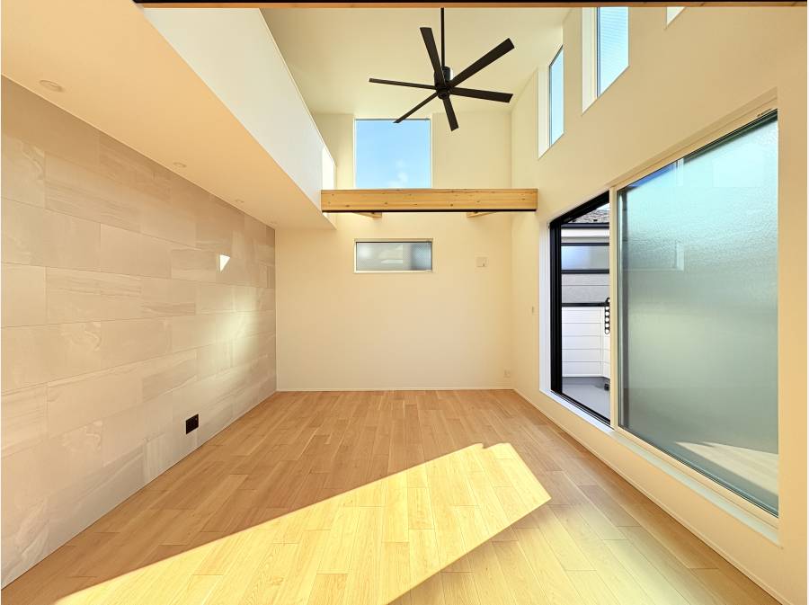 天井高を活かした吹き抜けを採用することで、明るく開放的な空間を実現しており、ご家族が自然と集まりたくなる心地よいリビングとなっています。