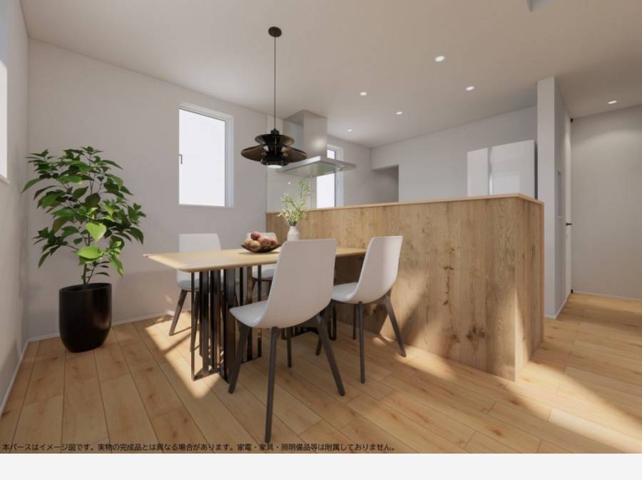 開放的な設計のLDKは、キッチン腰壁に板張りを採用し、インテリアのアクセントとなるだけでなく、住む人に安らぎを与える空間です。間取りは2SLDK+ロフトで、家族のライフスタイルに柔軟に対応しやすい設計となっています。