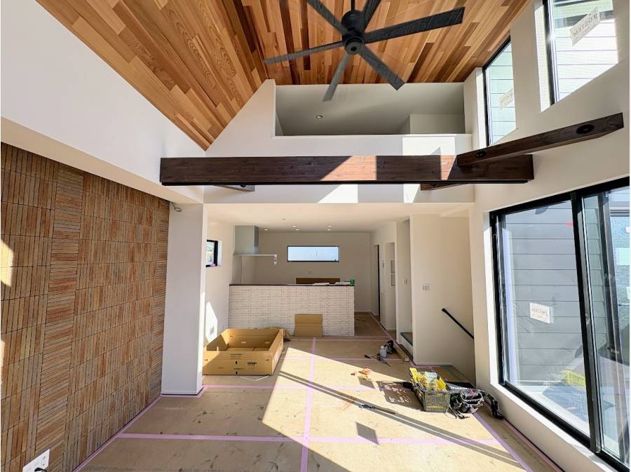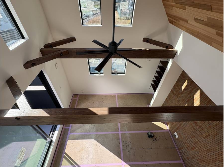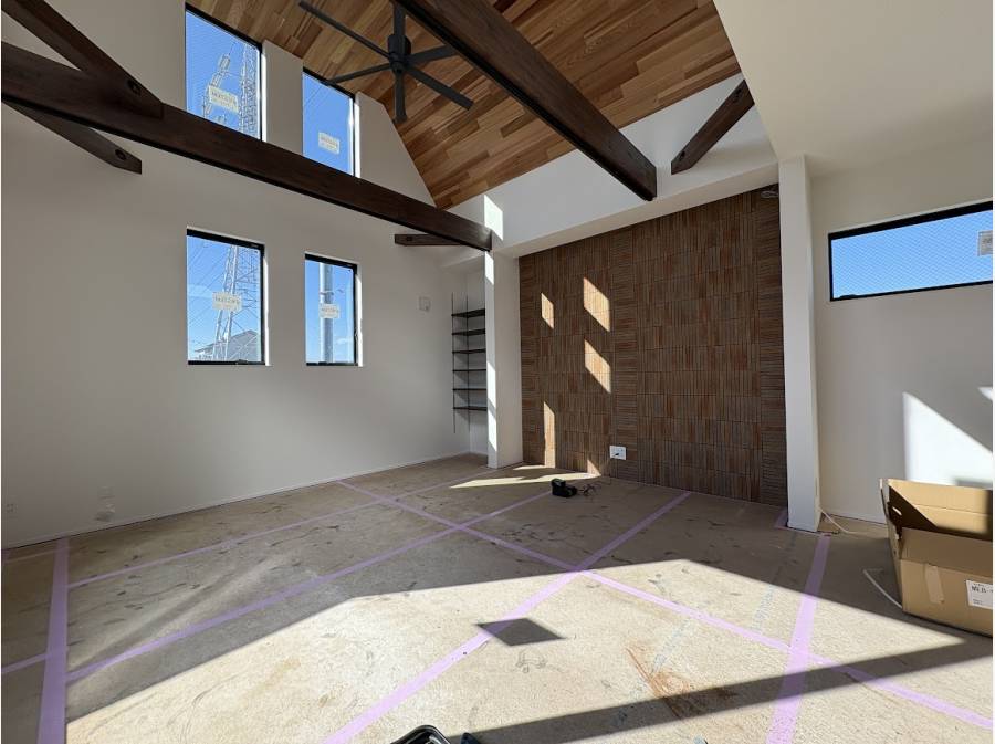 20.5帖の広々としたLDKは、上部吹き抜け構造により開放感が広がり、光がたっぷり差し込む明るいリビング空間。家族が自然と集まる、心地よい場所です。