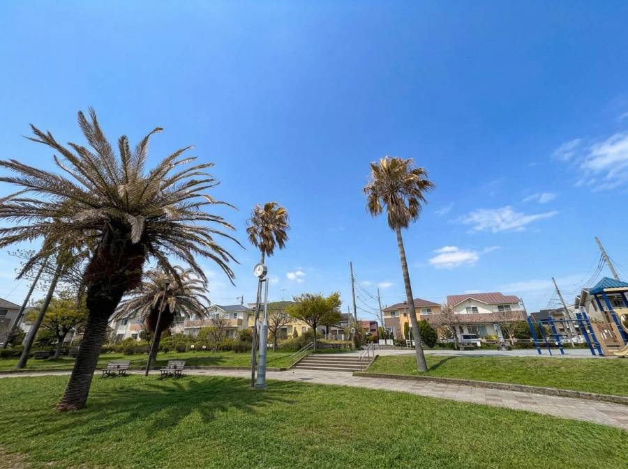 南国風の「せせらぎ公園」まで徒歩1分、スーパーも徒歩2分と生活に便利な環境。