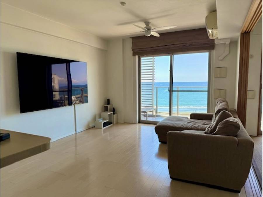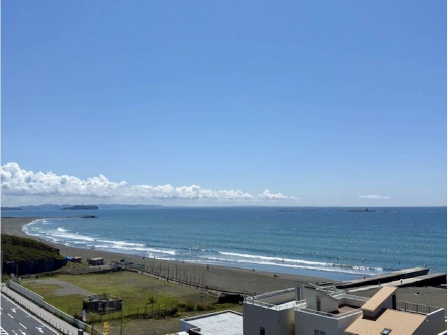 こちらは、茅ヶ崎サザンビーチ目の前に佇むオーシャンビューマンションの最上階寄り7階住戸。リビングに座ったままでも、窓越しに海を望むこの眺望は、何ものにも代えがたい日常のご褒美です。