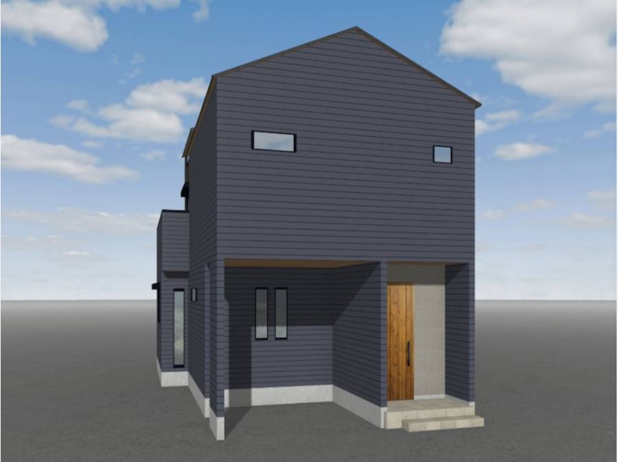 キリッと引き締まったブラックの外観と軒下や玄関ドアのウッド調が素敵な新築戸建。