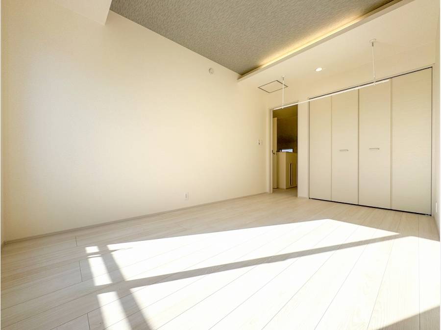 デザイン性のある折り上げ天井が魅力的な約7帖のベッドルーム。