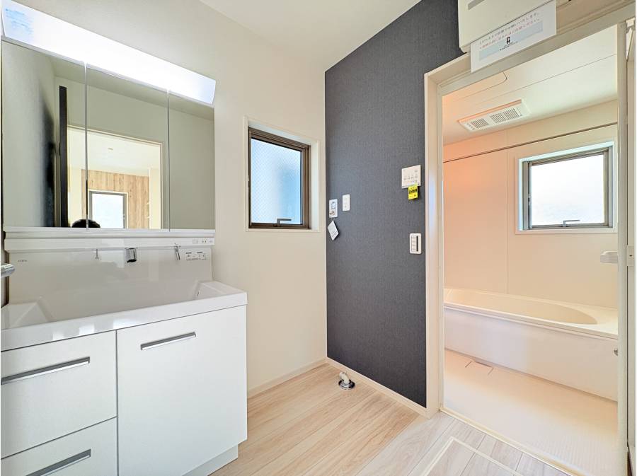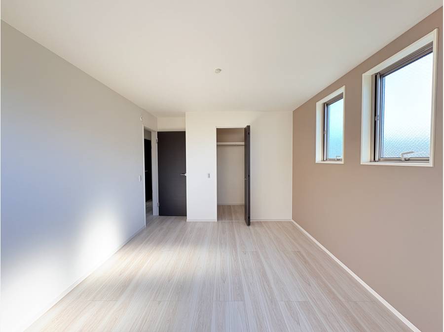 白を基調とした明るく清潔感のある室内に、湘南らしさを感じさせるアクセントクロスが映える、おしゃれな空間が広がります。