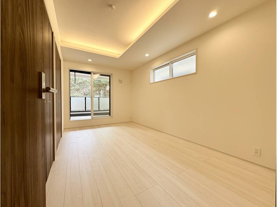 2階に洋室がまとまった間取り。折上天井に取り付けられた照明で雰囲気のいい洋室。広く洗濯時に嬉しいバルコニー。