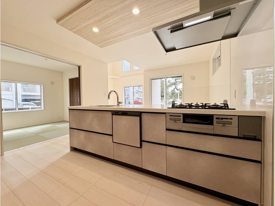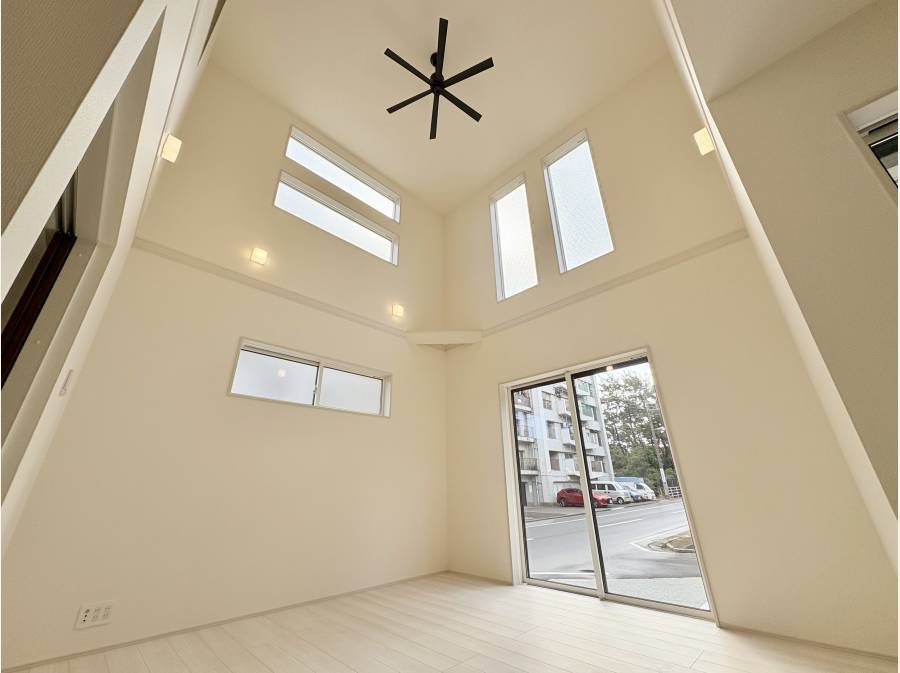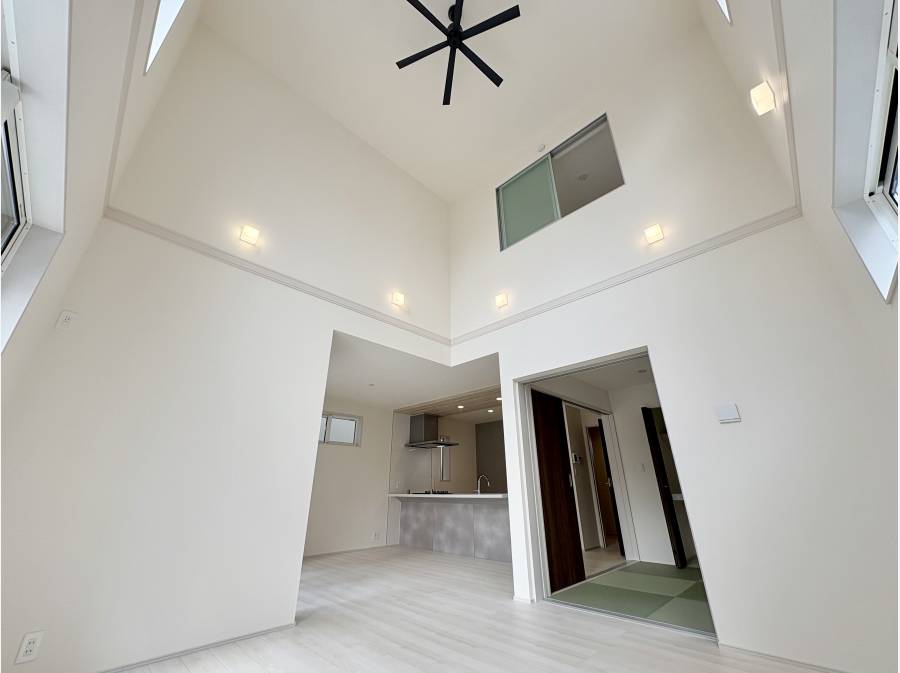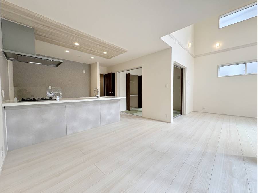 LDKは19帖。対面式のシステムキッチンに、採光・開放感たっぷりの吹き抜け空間のリビング。
