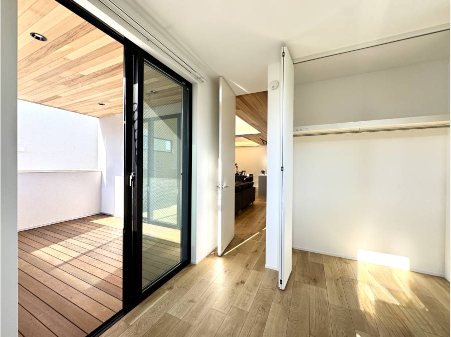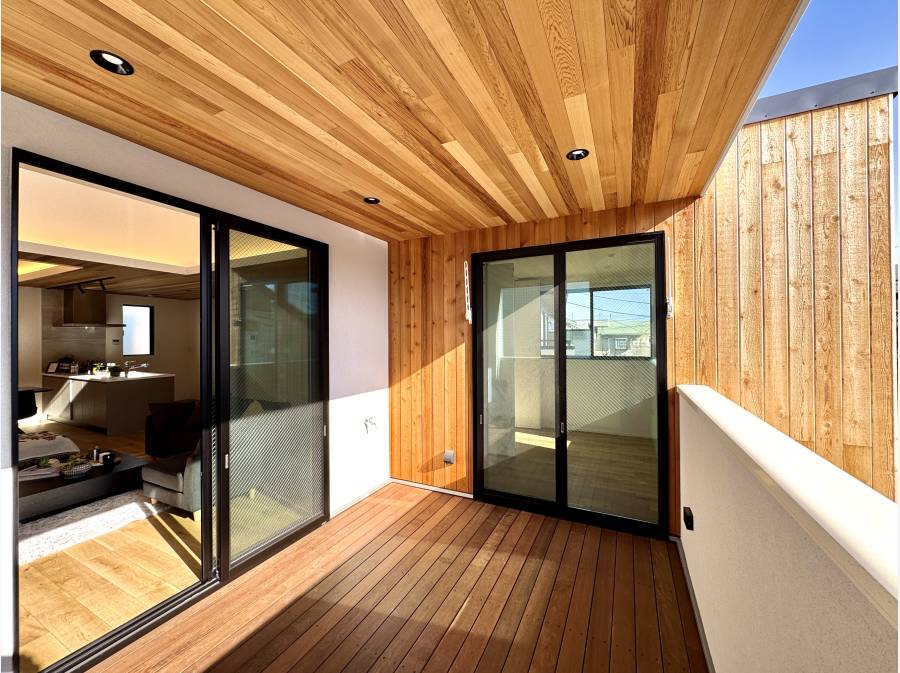 リビングからフラットでつながる大型のバルコニーは外空間を存分に楽しめる憩いの空間に