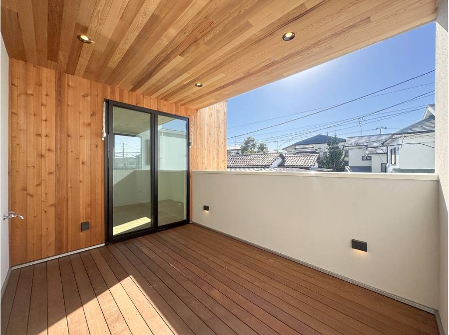LDKと居室のどちらからもフラットに繋がるバルコニーは木質感たっぷりで、まるでログハウスのよう。