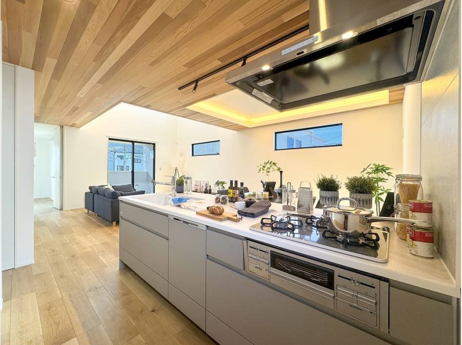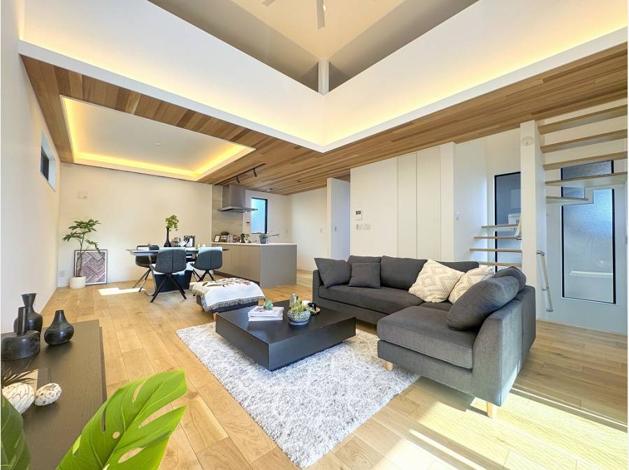キッチン側の天井は間接照明が映える折り上げデザインになっており、ワンフロアで異なる趣を感じられますよ。