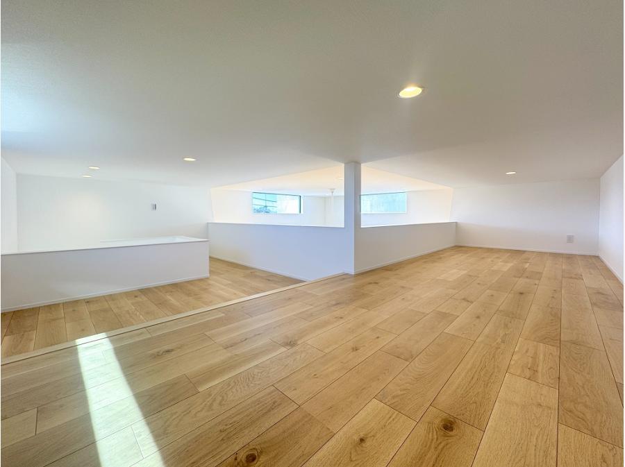 木漏れ日が射し込むスケルトン階段を上がれば、吹き抜けが心地よい22.5帖の大空間が広がります。