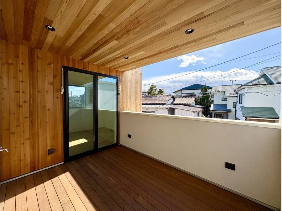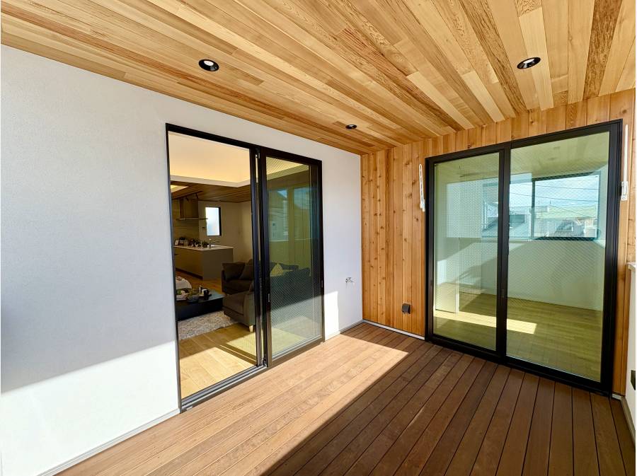 この住まいの特徴は、天然木の温もりを感じられる上質な空間設計です。玄関やダイニングの天井には独特な表情を持つレッドシダーを使用し、床材には天然木の突板を採用。さらに、外壁やバルコニーにもオイル塗装を施した天然木を用いることで、細部に至るまで本物へのこだわりが感じられる仕上がりです。