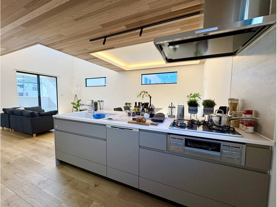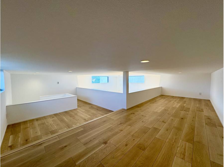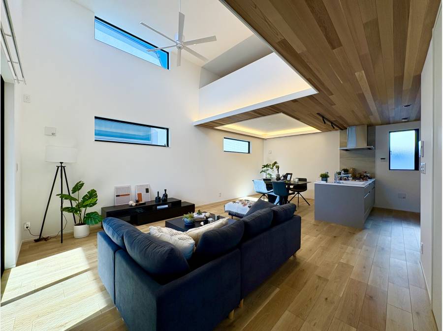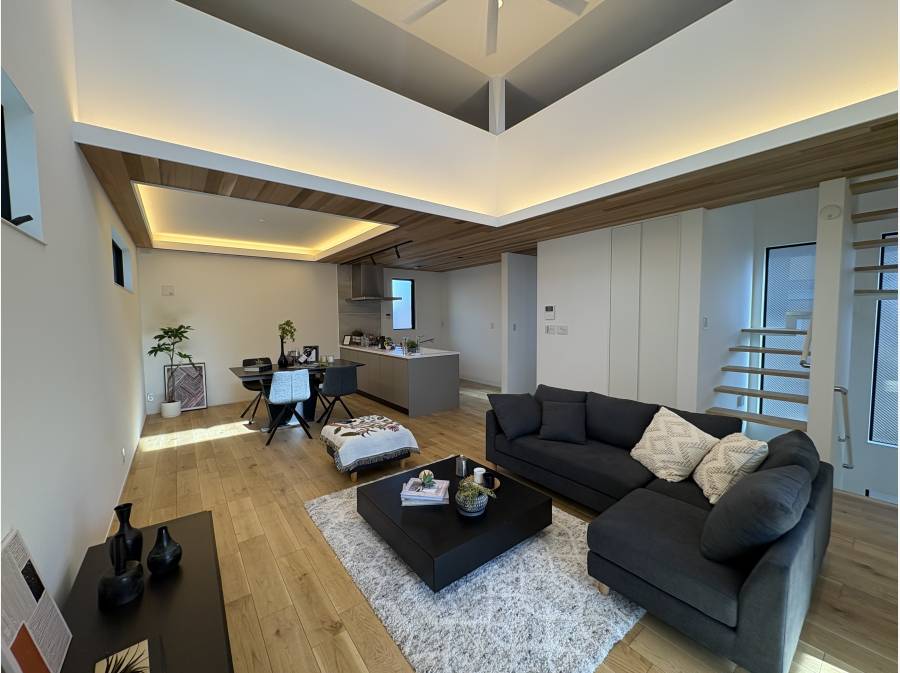 約22.5帖の広々としたLDKは、吹き抜け構造が生む開放感と間接照明が織りなす心地よい雰囲気が魅力。家族が集うキッチンや、ゆったりとした浴室など、日々の暮らしを豊かにする設備も整えています。また、固定階段で上がれる大型ロフトスペースは、収納だけでなく、多目的に利用できるプライベート空間としても活用可能です。