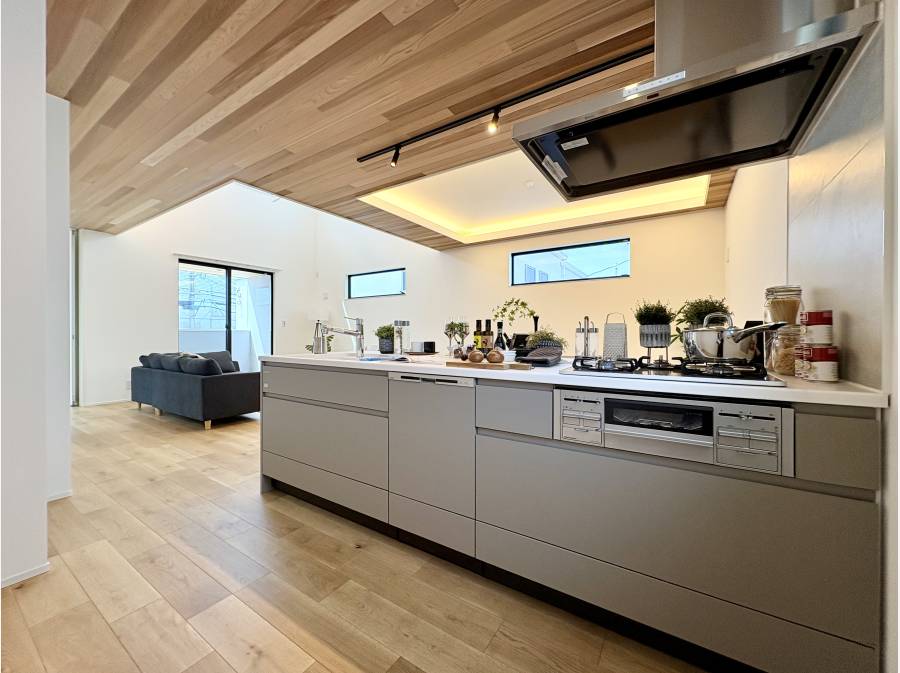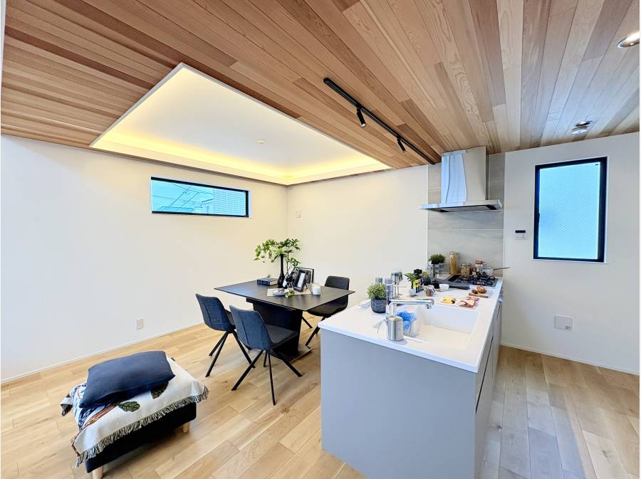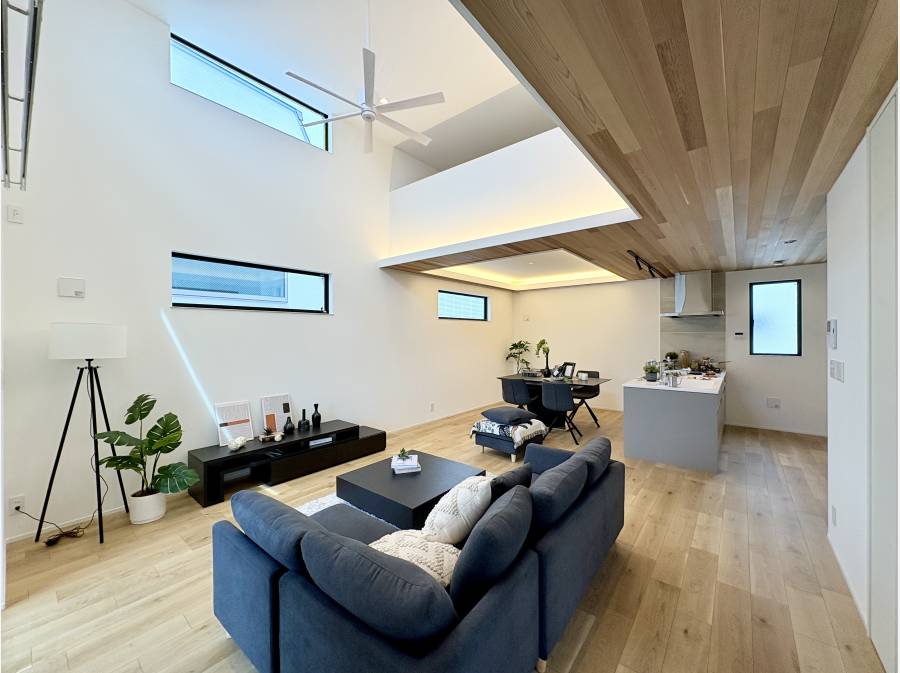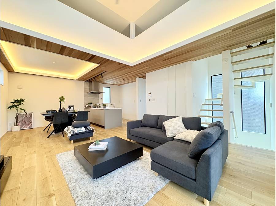 2階に吹き抜けと折り上げ天井を施したLDK(約22.5帖)照明がお洒落で開放感があり優雅な時間を堪能できます。