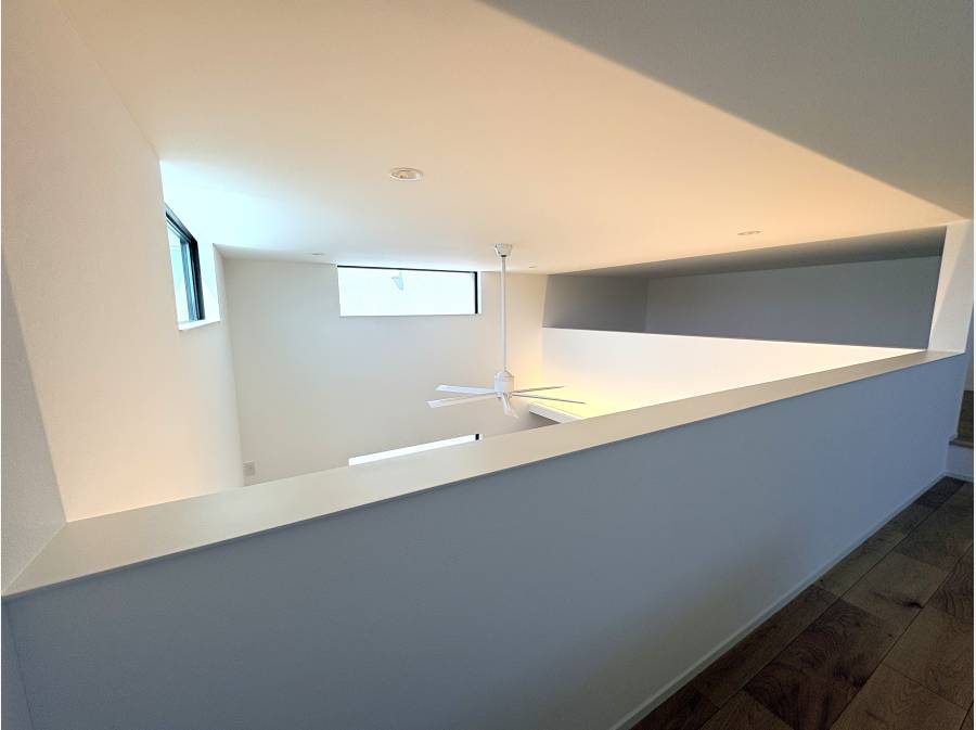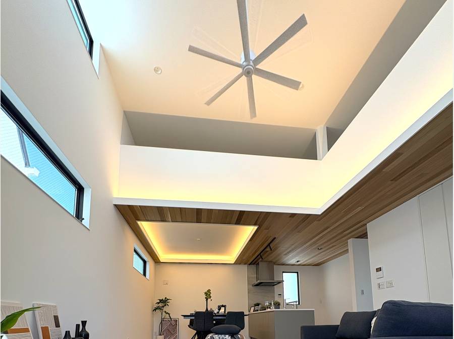 シーリングファンとスケルトン階段が空間のアクセントとなり、視線が上へと抜けることで実際の面積以上の広がりを感じさせます。
