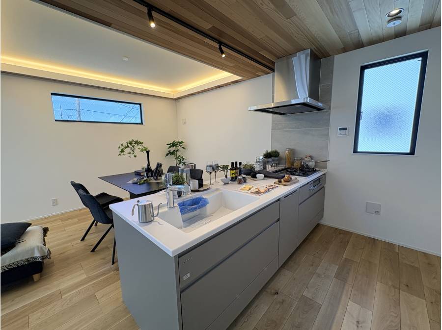 木目調の天井がお洒落なオープンキッチンは、リビングダイニングを見渡せる特等席。ご家族との会話を楽しみながら、開放的な気分で毎日のお料理ができます。