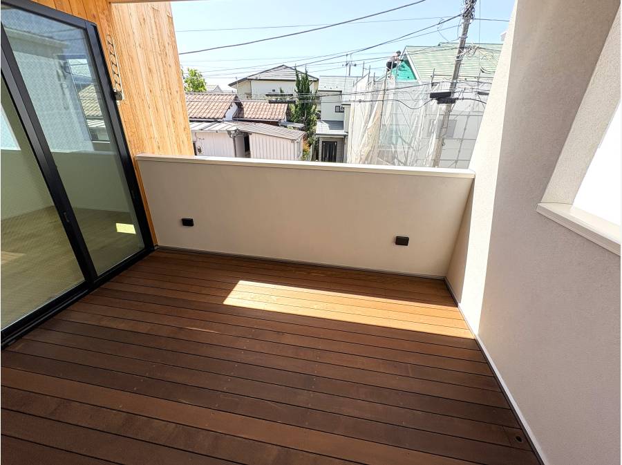 大きな窓から繋がる広々としたウッドバルコニーは、プライバシーが守られたくつろぎの空間。
