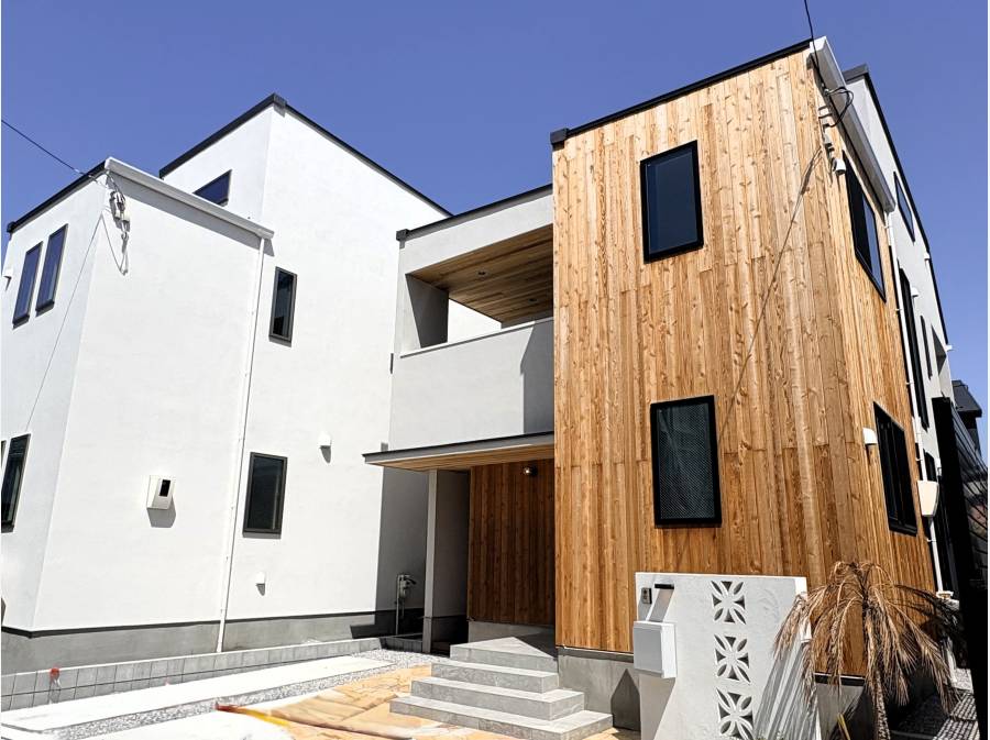 白と木目が調和した洗練された住まい。吹き抜けリビングやウッドバルコニーが光と風を招き、家族の時間を心地よく彩ります。