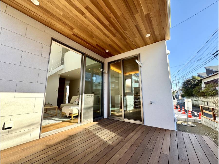 〇外壁はモダンなタイル貼り (300×600角のタイル)と耐久性に優れた割肌仕上げ、軒天にも天然木使用