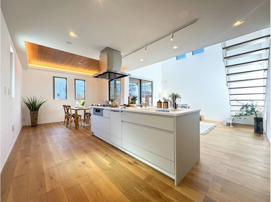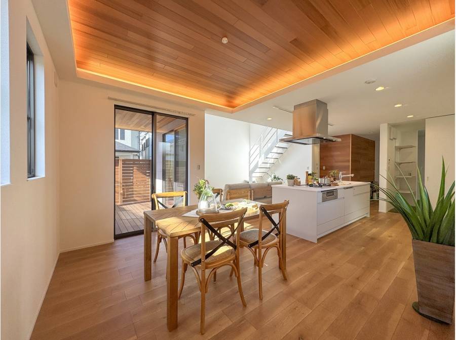 アイランドキッチンや折り上げ天井、軒付きのウッドデッキ…その全てが主役級の存在感を放ちながらも見事に調和した美空間。