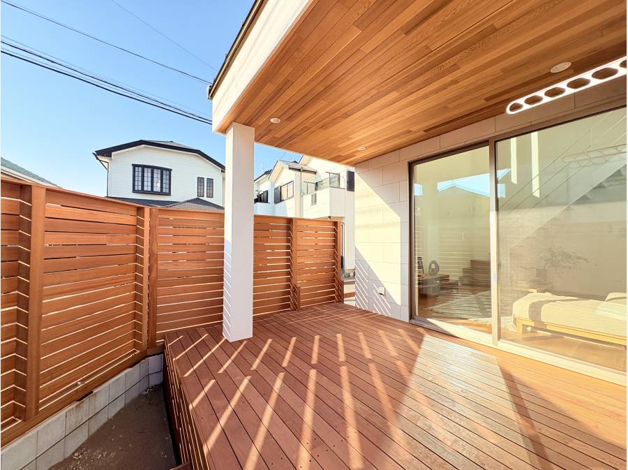 南西角に配置したウッドデッキは、周囲の視線を気にすることなく、