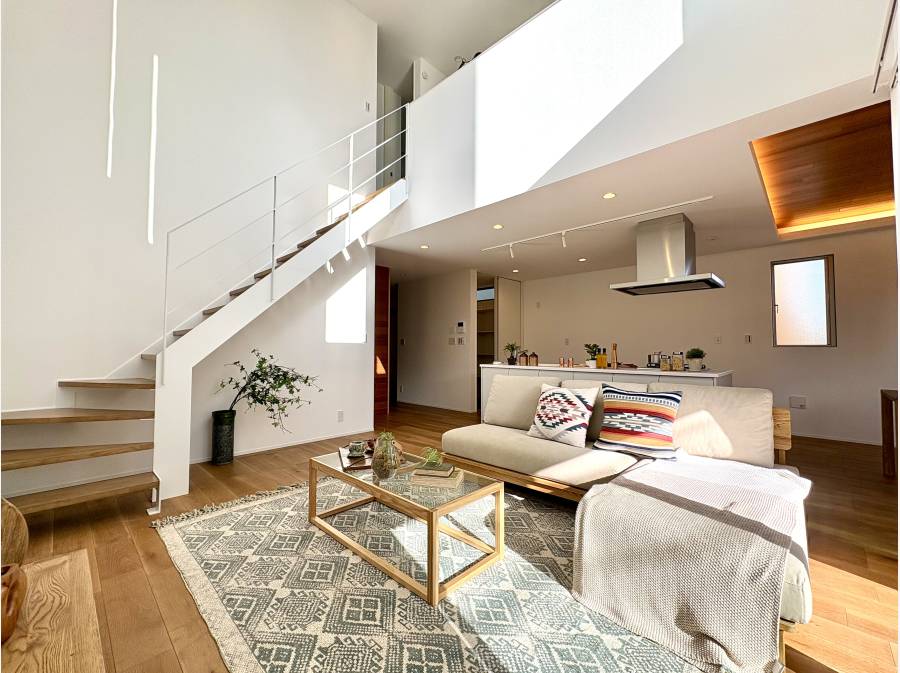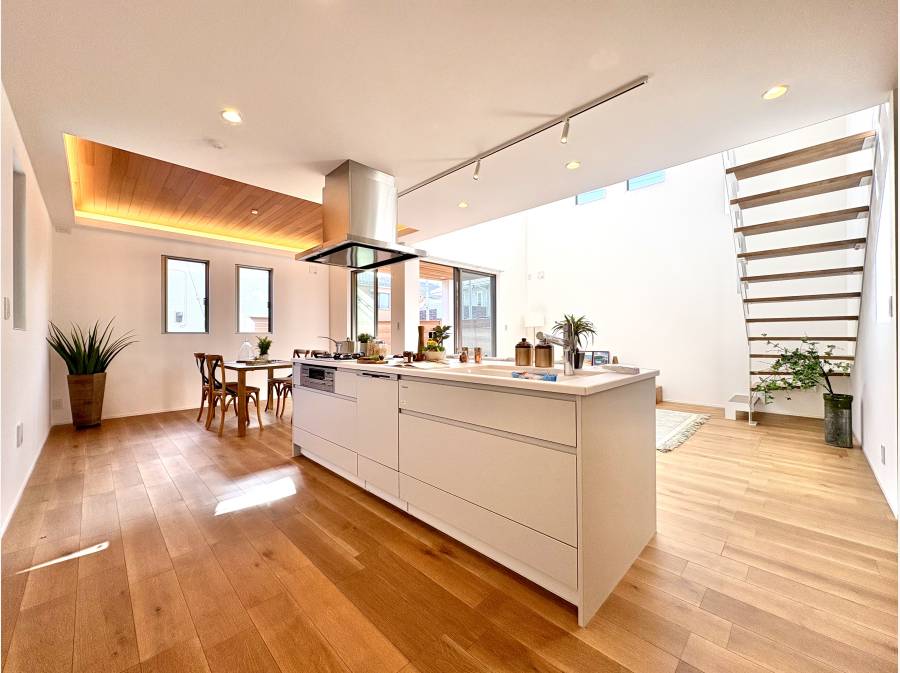 大型の吹き抜け天井と間接照明が開放的な空間を演出し、アイランドキッチンや天然木レッドシダーの折り上げ天井、天然の突板仕上げの床材が上質な心地よさをもたらします。
